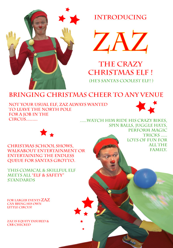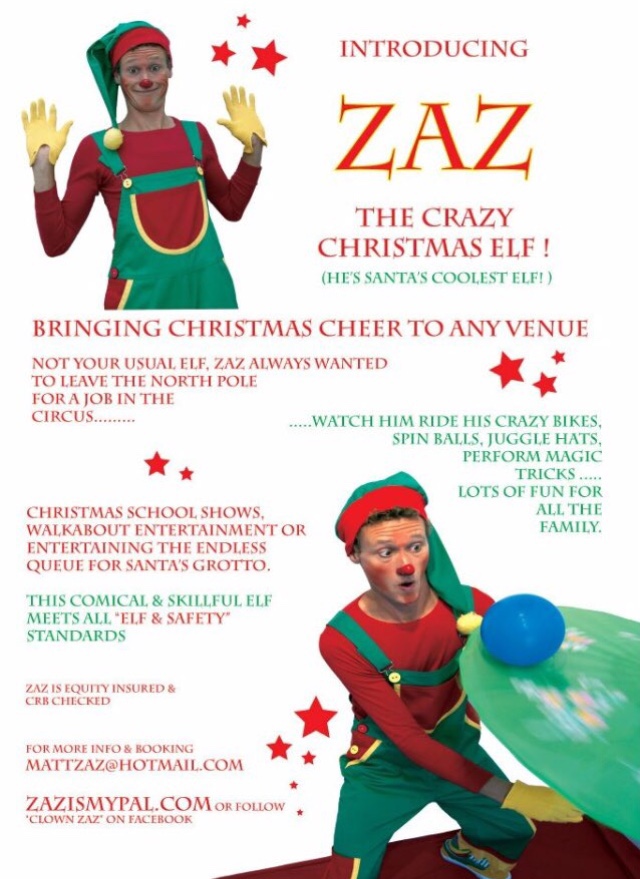 With Halloween been & gone its Christmas season! Zaz is back with his crazy Elf character that always wanted to be a clown in the circus. Fun mini circus show, walk about & Santa queue entertainment Suitable for nursery groups & primary schools, oap care homes, charity & family friendly Xmas events. Enquire here now for last minute availability this coming Christmas season!