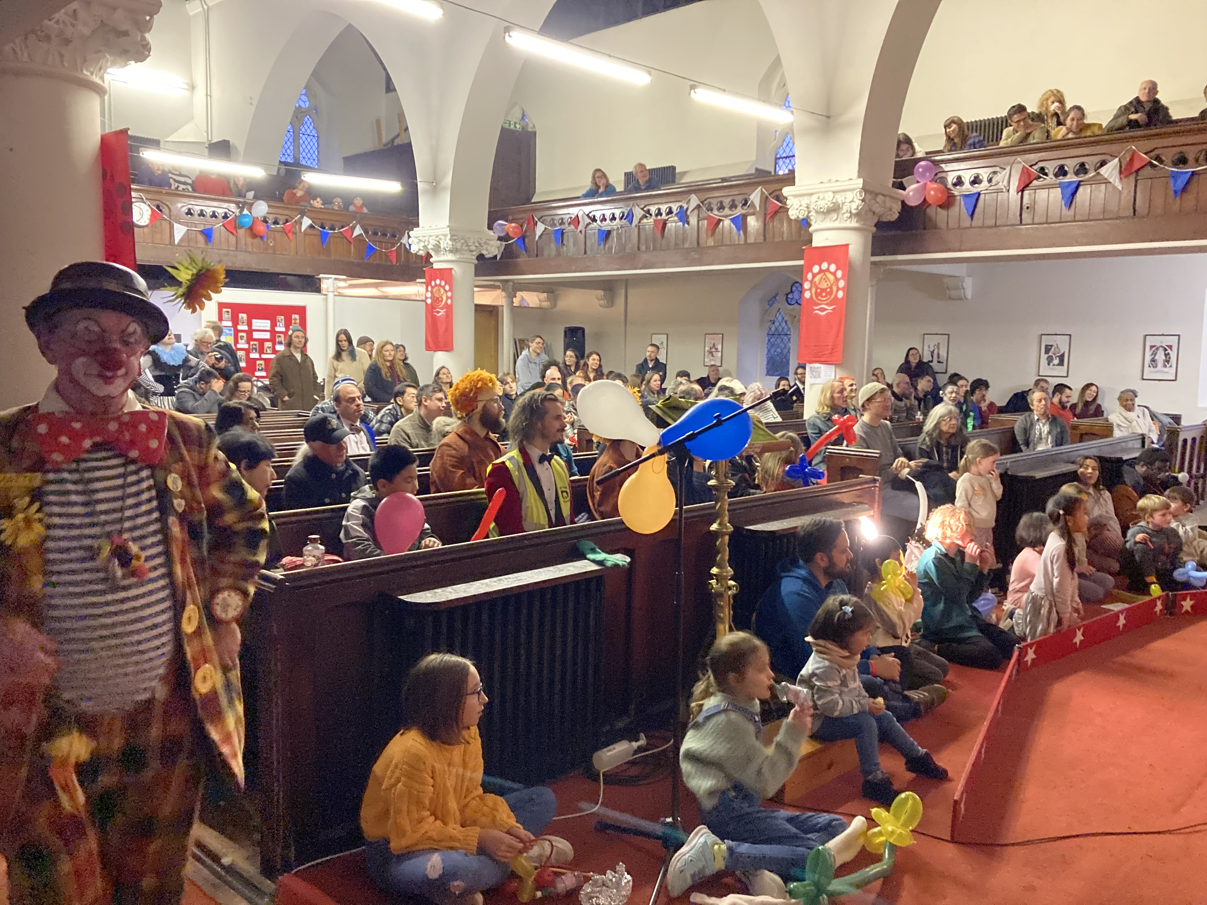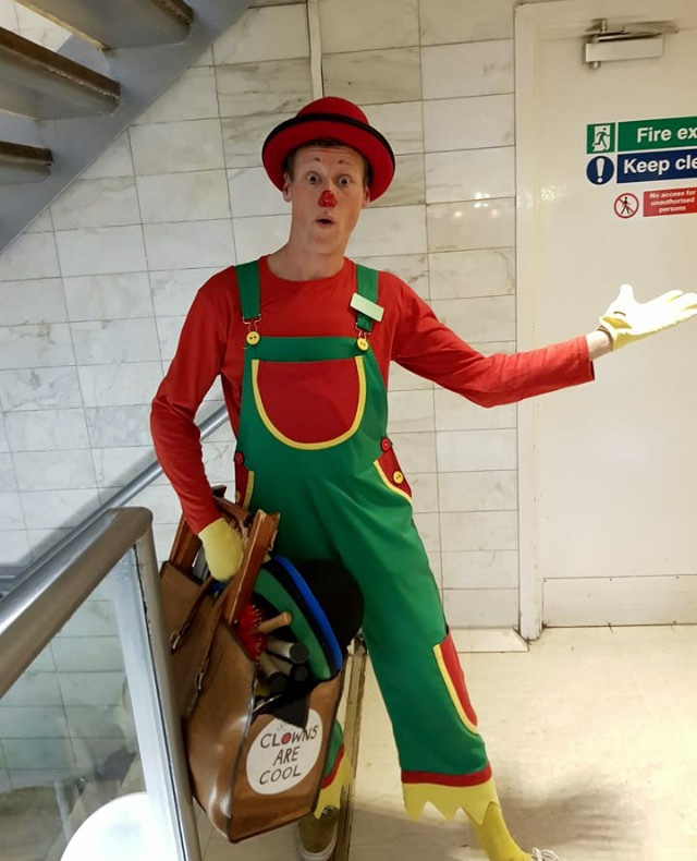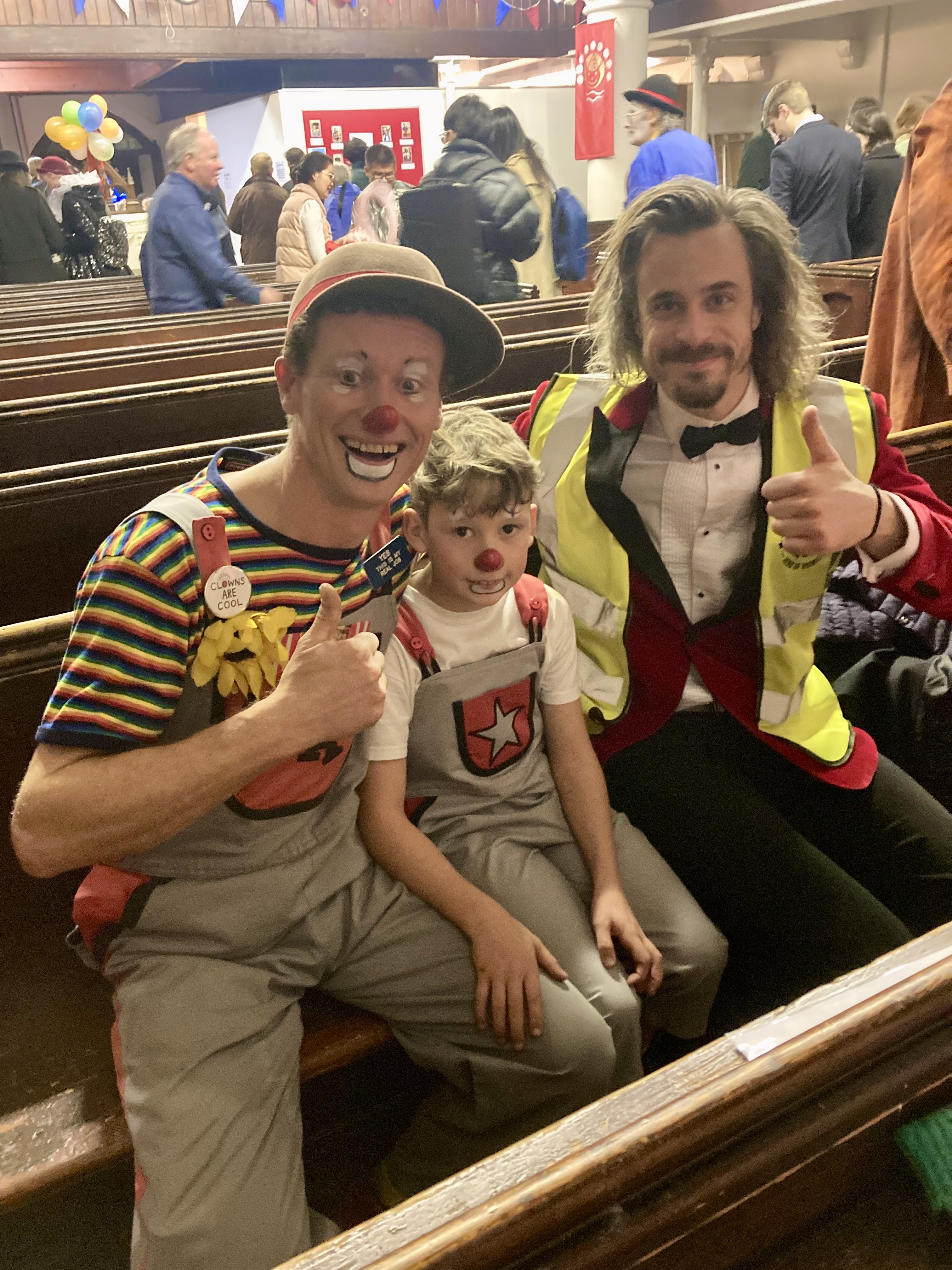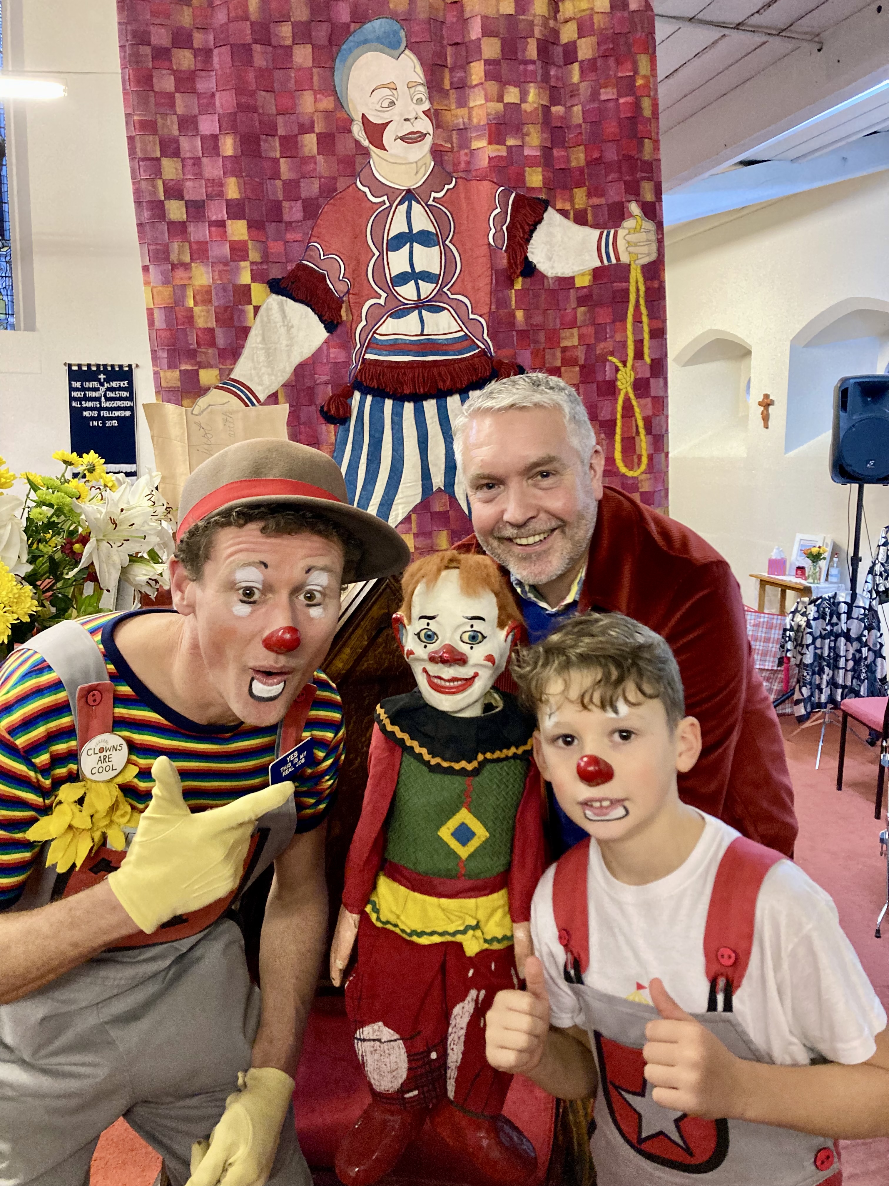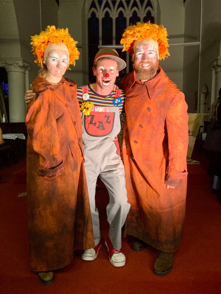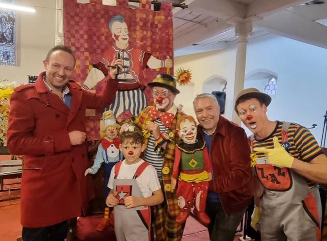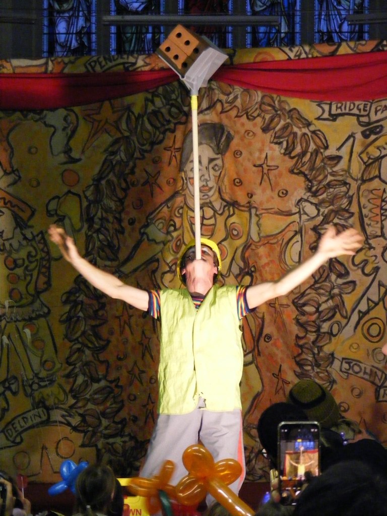 Irrespectively of their own religious beliefs Clowns from all over the UK and overseas come to remember joeys who have left us & celebrate clowning & father of clowns Joey Grimaldi. I have been to this event many times and, I have been going since I was a teenager & I try to attend & help out when I can, my children now come with me also… Again it was a wonderful service this year and nice to see clown friends that I often don’t see, fantastic to see the public packing into the church again to witness this interesting clown tradition (during covid the service was held online. Grimaldi Sunday always ends with cutting & sharing of the cake with a free clown show for the local community before everyone says farewell..this year in the show my son Ollie (9) helped me with a builders act we have been working on, it involves large hammers a sore thumb, juggling Pieces wood & balancing bricks! Both Ollie & I were featured in the Independent news paper, & here are some lovely photos from the day thanks to Steve Jacks & Gaz de vere for the photos.