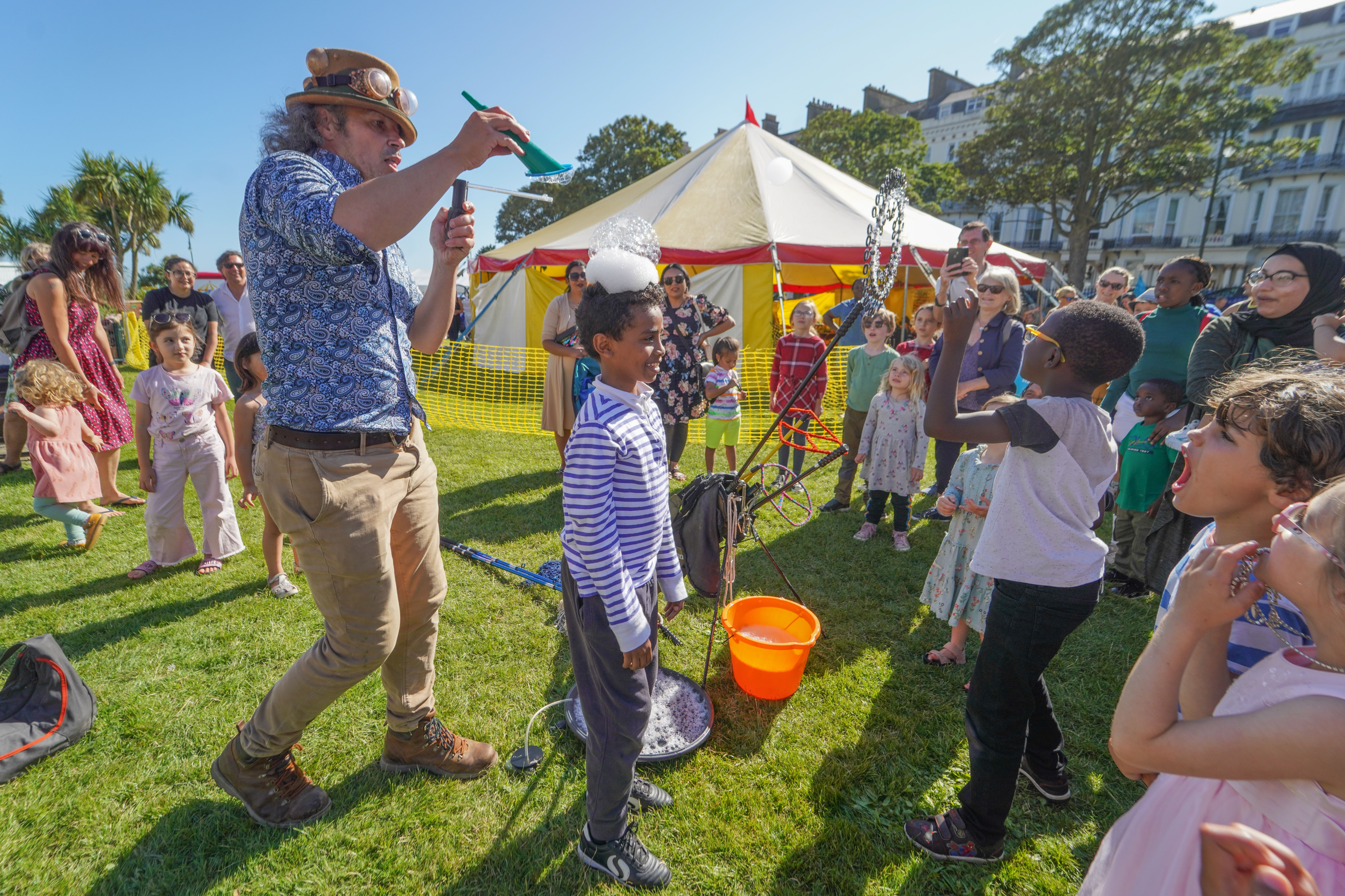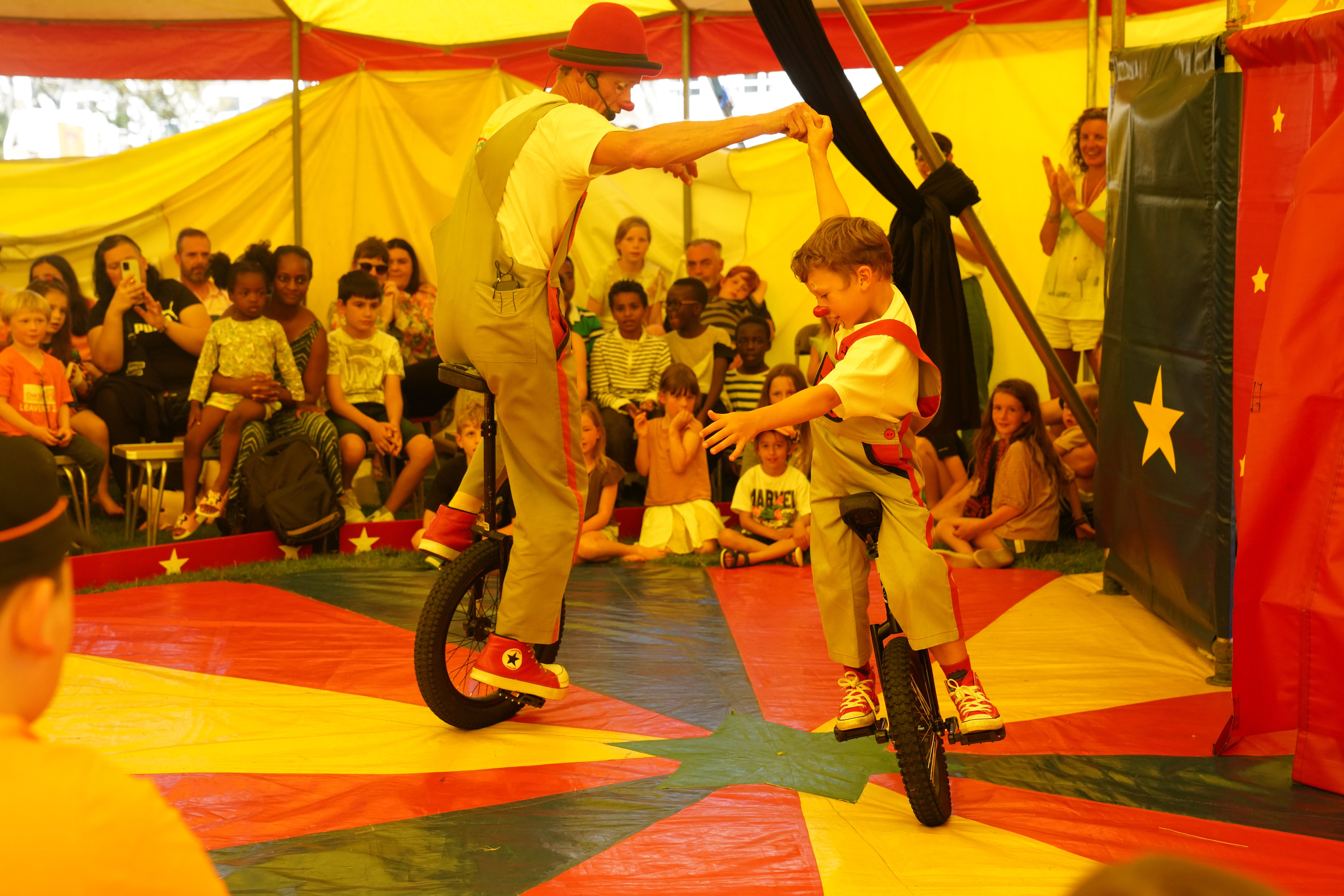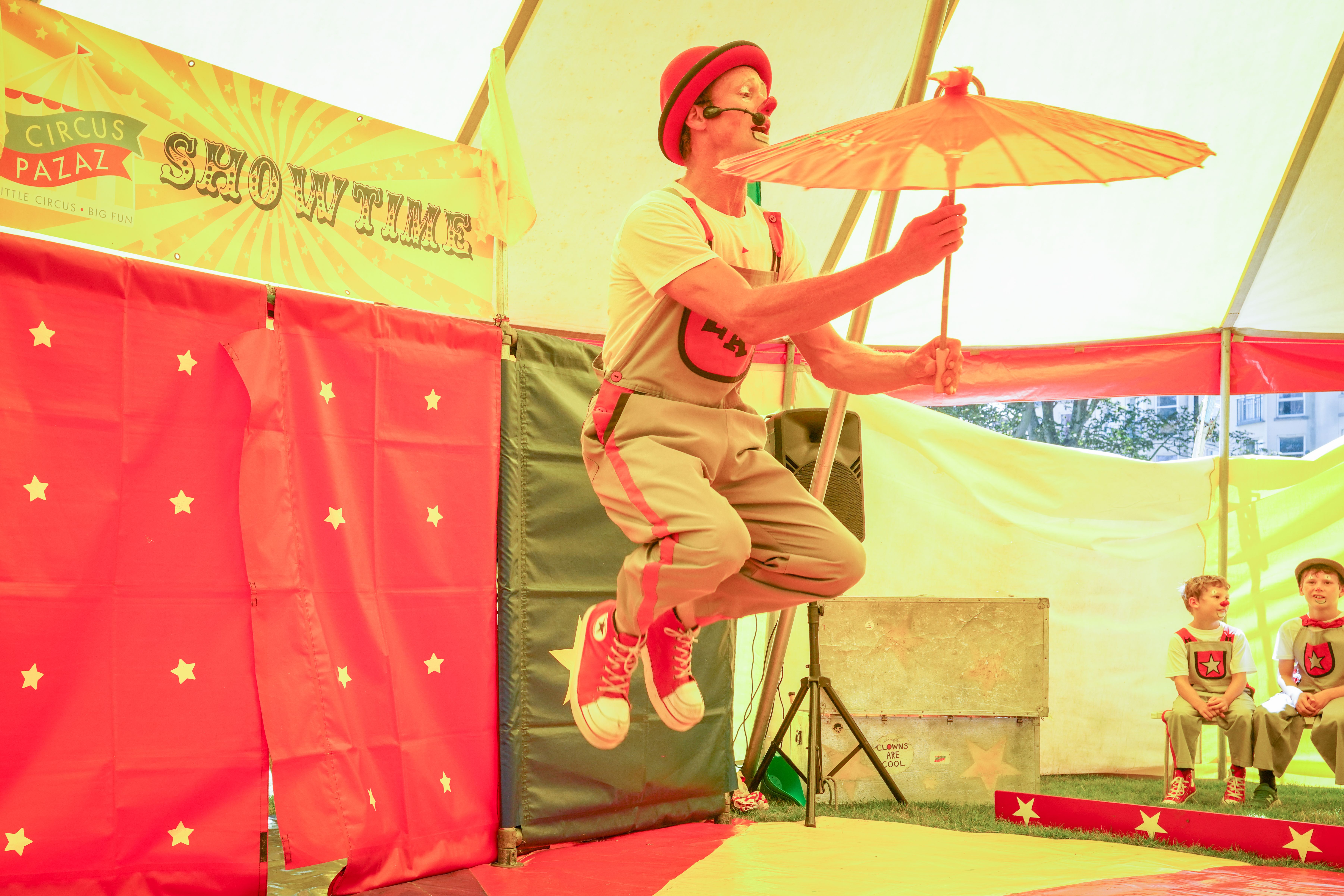 With Tilly & the team taking the bigtop tent out it meant that I could choose not to do some of the school tour particularly during the week due to my own family commitments & also could take any smaller event jobs were the bigtop wasn’t required often more locally + for the 1st time circus pazaz could be in 2 locations at the same time ie the main tent & the small 20ft tent with open air show, which is exactly what we did as we were invited & shipped back to the channel Islands for our 6th time to supply our family entertainment for the brilliant Alderney week community festival last year’s being the 73rd held!. Took the kid’s along to the British Juggling Convention in Ramsgate, did some children’s charity visits as well as a few children’s birthday parties back in a good old hall or function room again! Zaz took the little clowns to quite a few events to either provide a playscheme circus workshop or clown show, here are a few photos of us in action! Looking forward to next summer already get in touch if you would like more info on booking us for your event!
